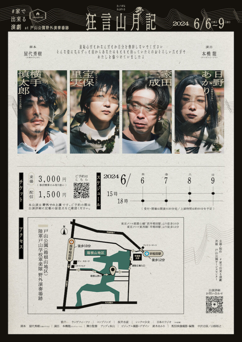 ・小雨決行、荒天中止。開演の2時間前までに上演開催情報をご予約のお客様へのメール、公式SNSにてご案内します。