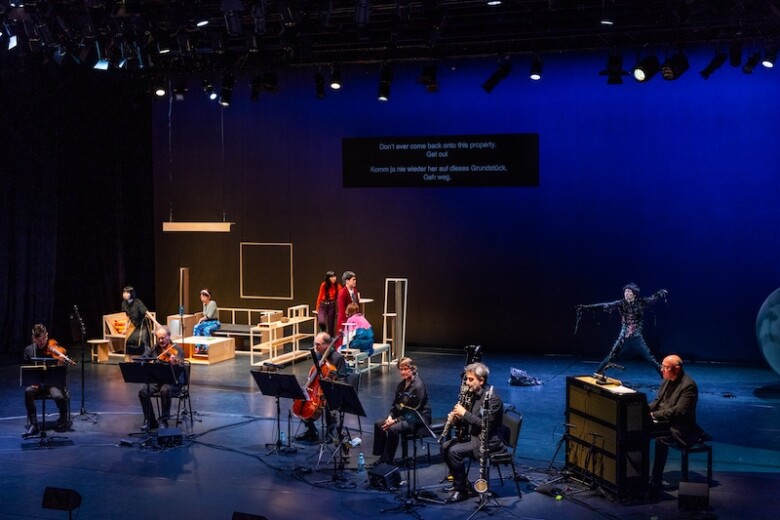 賃貸契約の一方的な破棄により、住む家をいきなり追い出されそうになる家族の物語だが、次第に人智の及ばない強大な力が見え隠れし始め、その問題自体が舞台上から消え去り——人間の世界を圧倒する存在が上演を支配し、まったく新しい世界が舞台上に立ち現れる、という構成で、演奏家が舞台空間を共有し、演劇と音楽のパフォーマンスを舞台上に並置することにより、双方が溶け合った先にあるフィクショナルな空間を生み出すことを目指した”音楽劇”だ。
