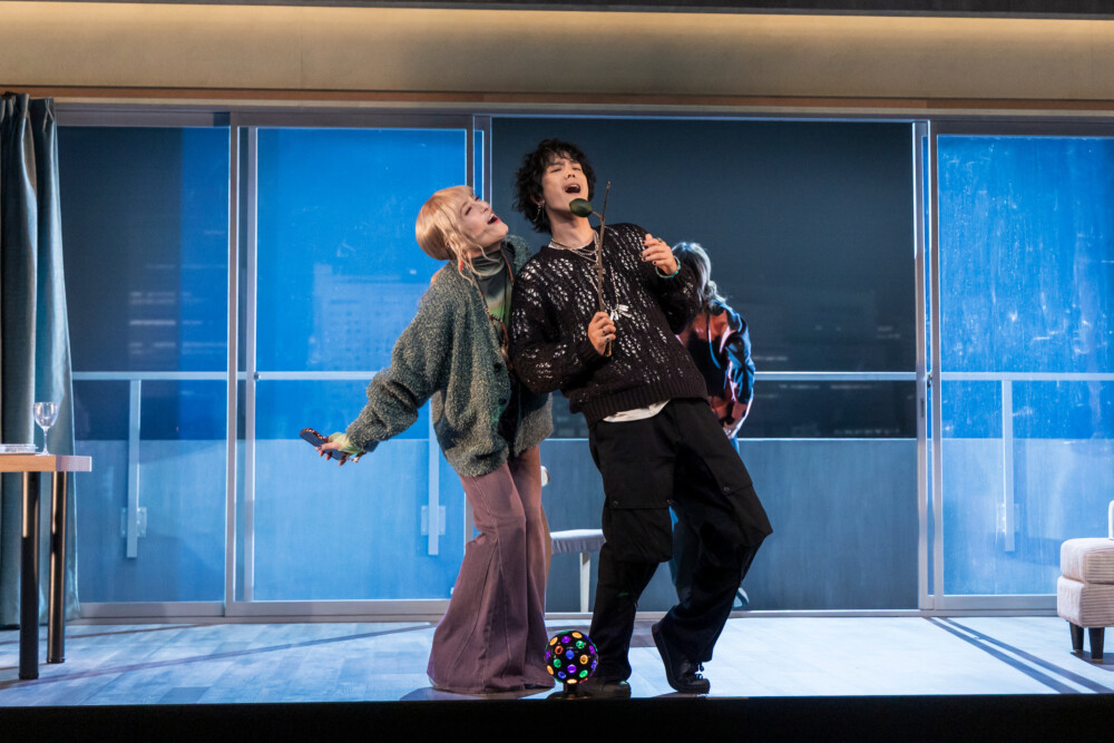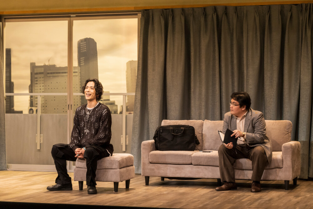 ショウコの母アキコ(銀粉蝶)が新人マネージャーのトゴシ(小日向星一)に付き添われて事務所にやってくる。午後、ジンの元恋人で、今や事務所を背負う存在になったエート(黒羽麻璃央)がライター・コマ(駒木根隆介)による独占インタビューを受けるという。ノンバイナリーのタレントとして人気を集めているホムラ(永田崇人)は最近エートと親しい様子だ。