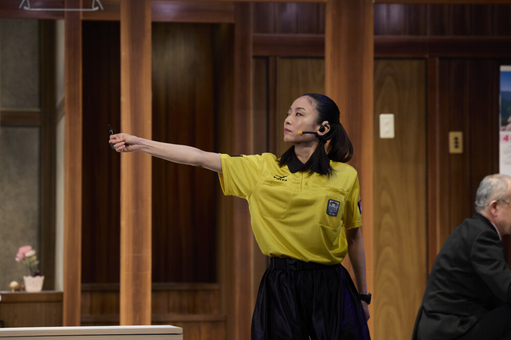 ステージ上にはモニターや解説席が現れ、審判まで登場し、舞台は謎の空気感に包まれます。